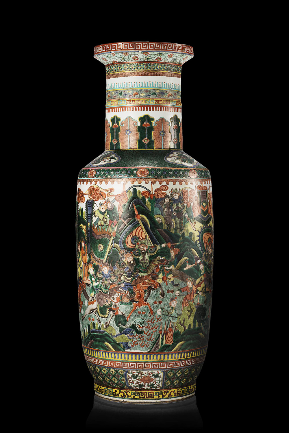 Grande vaso rouleau in smalti Famiglia Verde decorato con scene di battaglia di guerrieri armati e a cavallo (difetti e ripari) Cina, sec. XIX A large rouleau Famille Verte vase decorated with armed warriors on horses engaged in battles (losses and repairs) China, 19th century (h. 90 cm.)