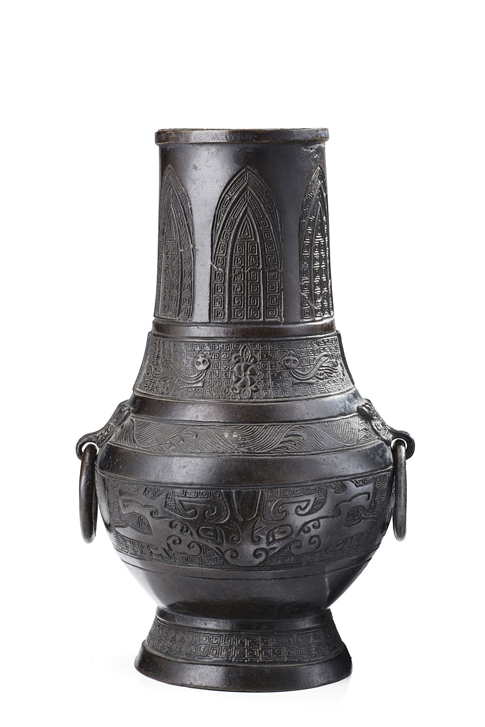 Vaso in bronzo dalla forma arcaica hu, con doppie anse ad anelli, decorato con motivi geometrici e maschere taotie (difetti) Cina, tarda dinastia Ming, sec. XVII A bronze vase of archaistic shape hu, with twin ring handles, decorated with geometric motifs and taotie masks (losses) China, late Ming dynasty, 17th century (h. 21 cm.)