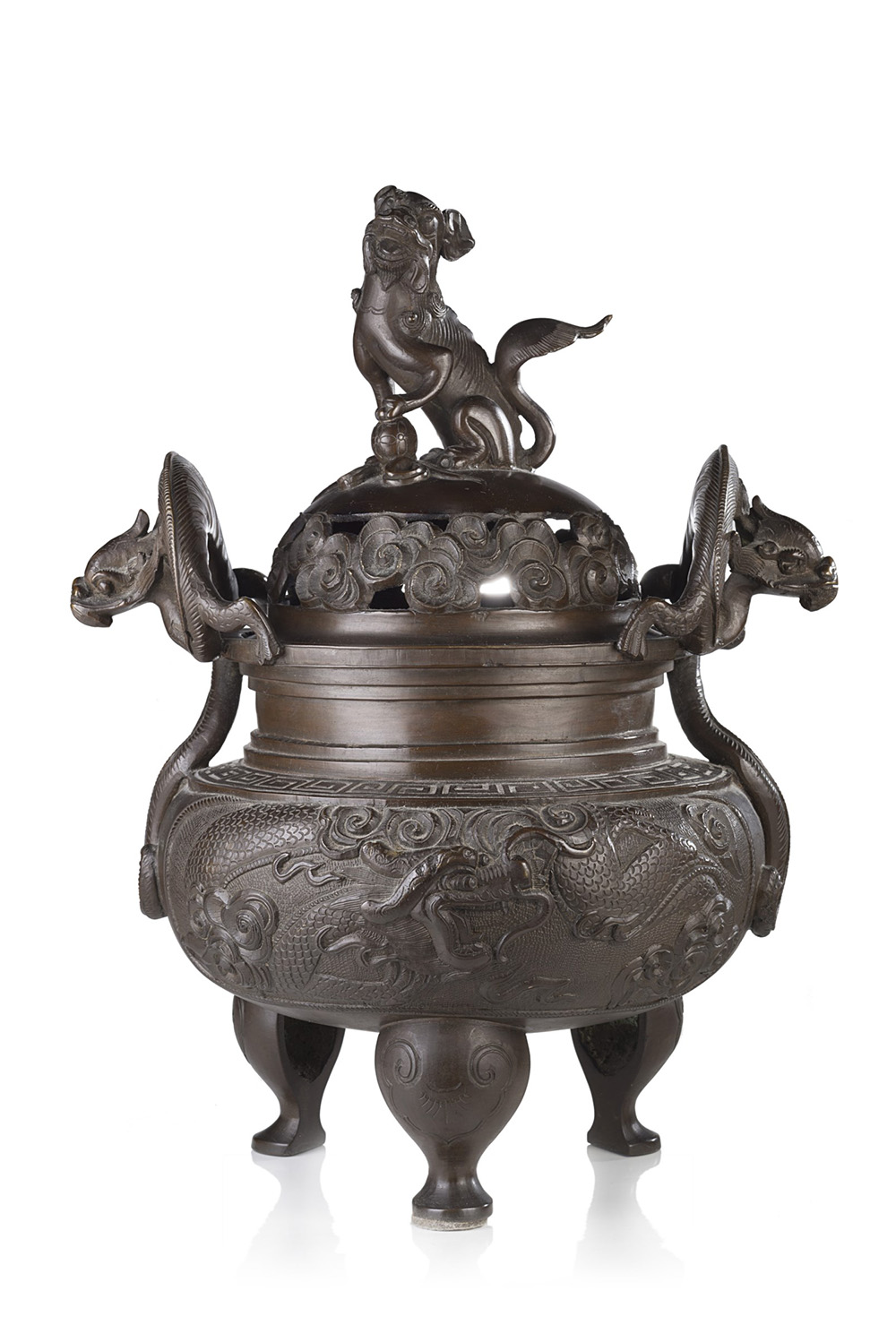Bruciaincenso in bronzo tripode con coperchio, riccamente decorato con draghi e leone buddhista Cina, sec. XX A bronze tripod censer and cover decorated with dragons and Buddhist lions China, 20th century (h. 32 cm.)