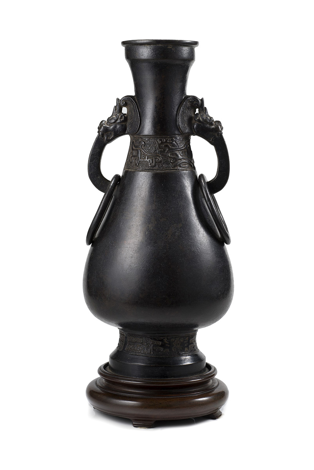 Vaso in bronzo dalla forma arcaica, con doppie anse e anelli in sospensione, decorato con motivi stilizzati, con base in legno Cina, tarda dinastia Ming (1368-1644) A bronze vase of archaistic form, with twin monster head handles suspending rings, decorated with stylised motifs, with wood base China, late Ming dynasty (1368-1644) (h. 28 cm.)