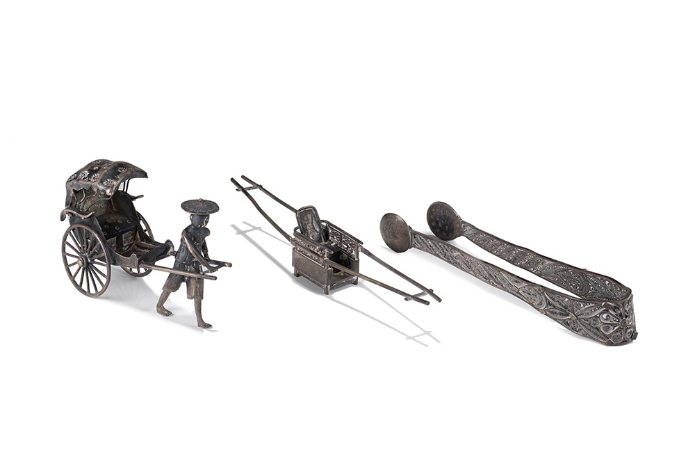 Tre oggetti di gusto orientale in argento: una pinza, un uomo con carretto e una portantina Three Asian silver items: a pair of tongs, a miniature carriage and a man with a cart (l. max. 14 cm.)