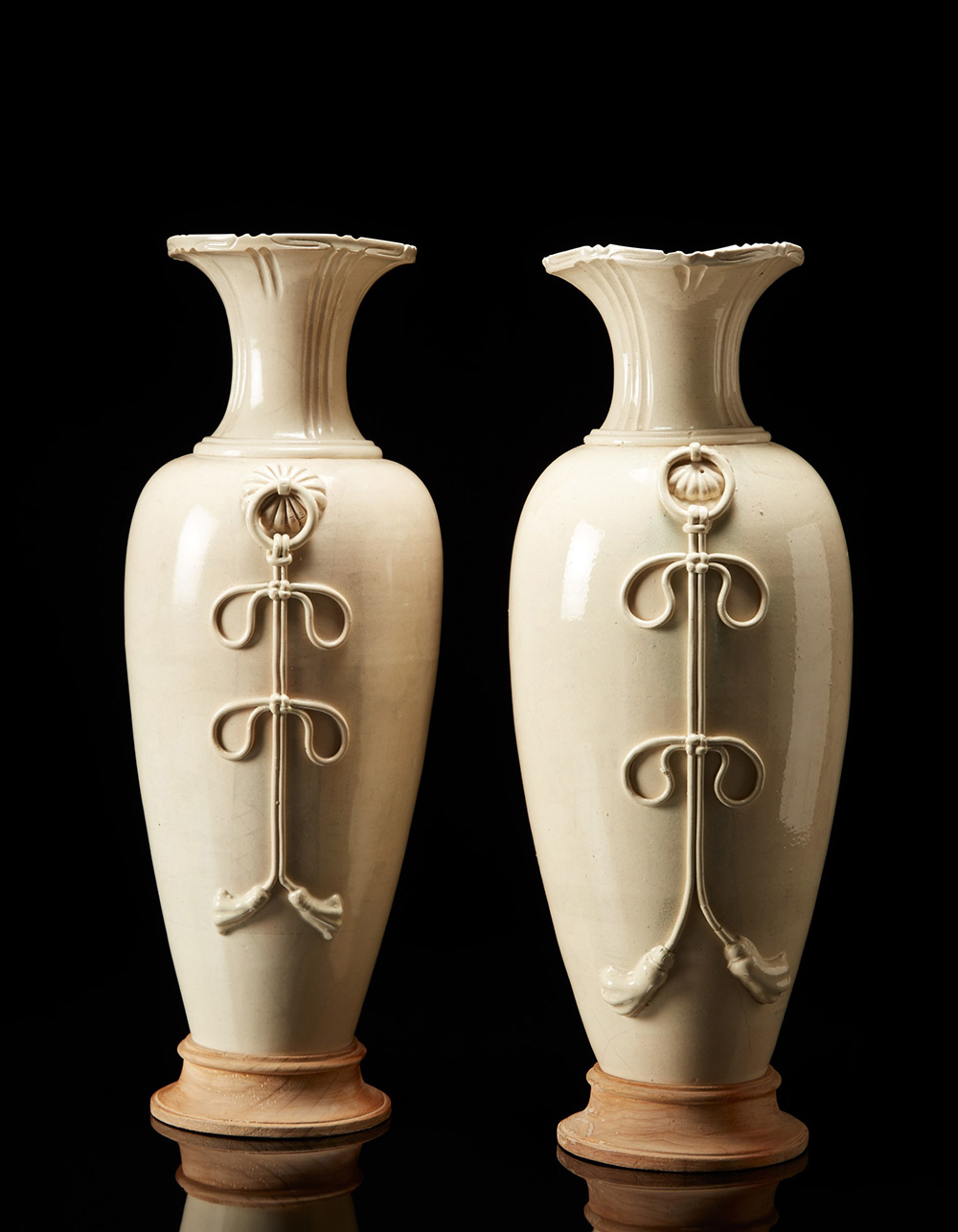 Coppia di vasi con decorazione applicate invetriatura color avorio base in...