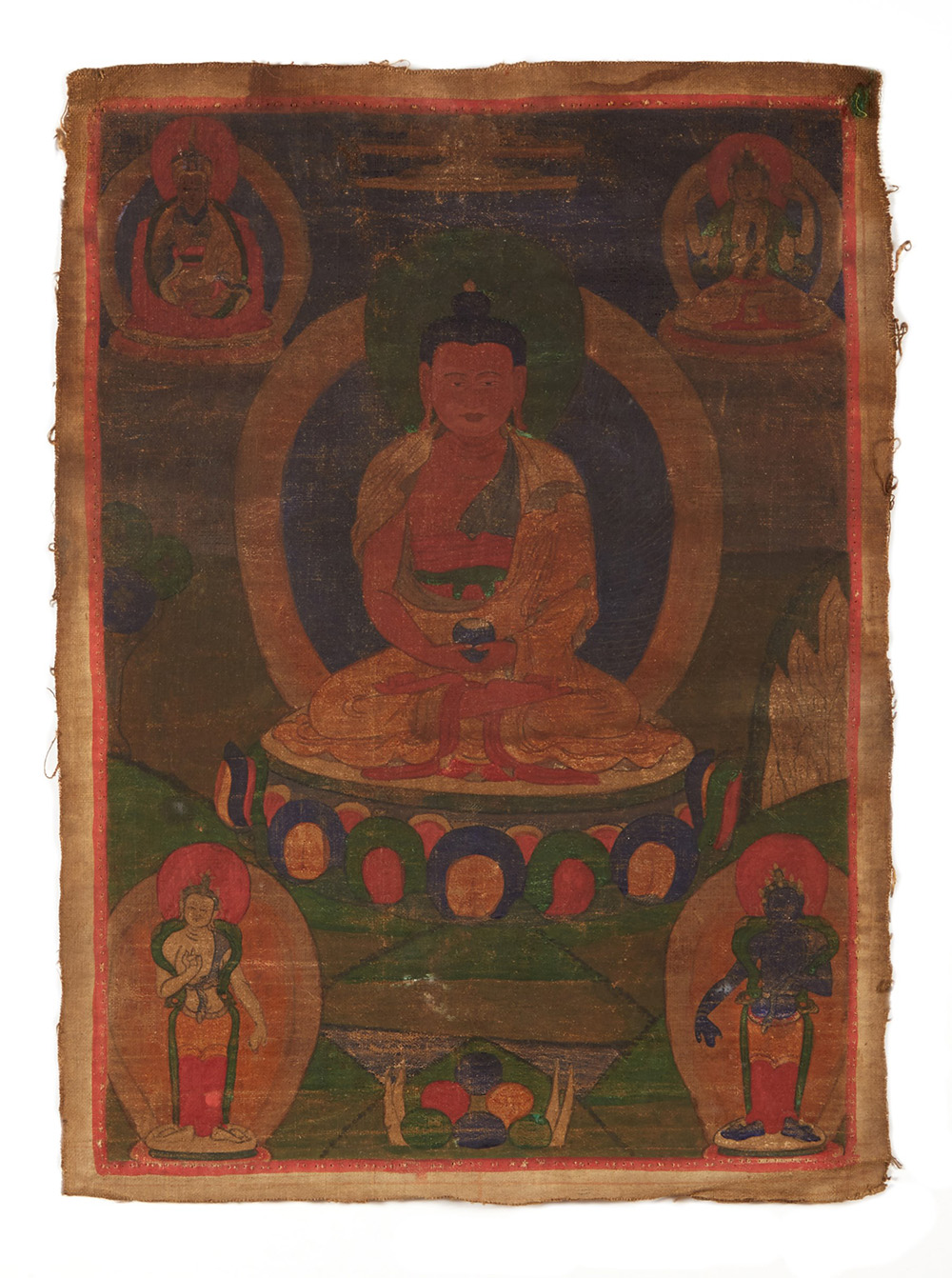 Piccolo thangka policoromo con buddha al centro nei toni del rosso e del blu Nepal, XIX sec. A small polychrome thangka depicting a central Buddha in red and blue tones Nepal, 19th century (30x40 cm.)