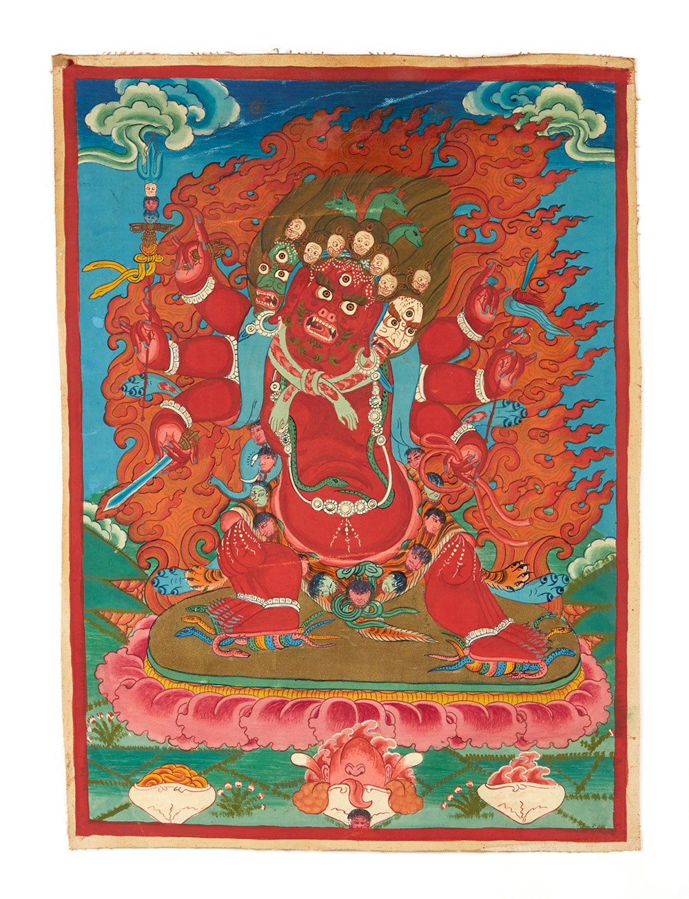 Piccolo thangka policromo con divinità dalle molte braccia Mongolia, sec. XIX A small polychrome thangka depicting a multi-armed deity Mongolia, 19th century (26x36 cm.)