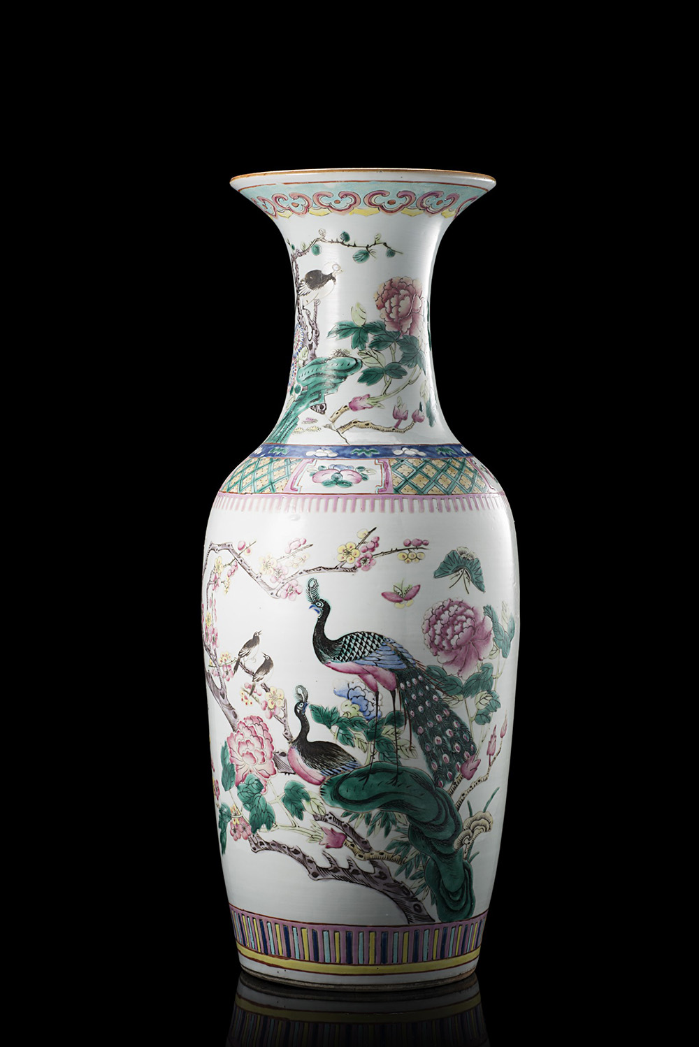 Vaso in porcellana Famiglia Rosa decorato con coppia di pavoni tra rami in fiore Cina, sec. XIX A Famille rose balauster vase decorated with a pair of Peacocks among flowering branches China, 19th century (h. 60 cm.)