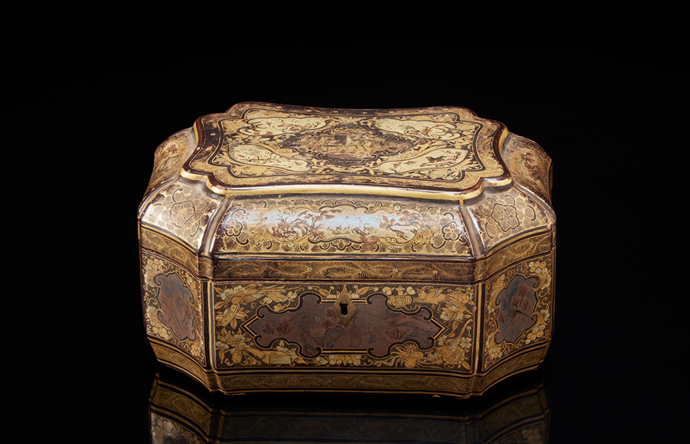 Scatola ottagonale laccata in nero con dorature decorata con figure in paesaggio, all'interno due contenitori per il tè in metallo bai tong con pomolo in osso Cina, metà sec. XIX An octagonal tea box lacquered in black and gilt with figures in landscape scenes, the interior with two bai tong tea compartments, with bone finial China, mid-19th century (24x19x14cm.)