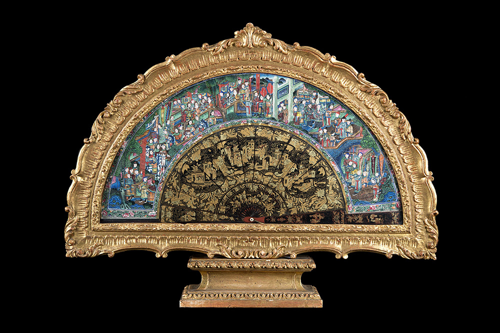 Grande ventaglio con stecche laccato in nero e oro, dipinto su entrambi i...