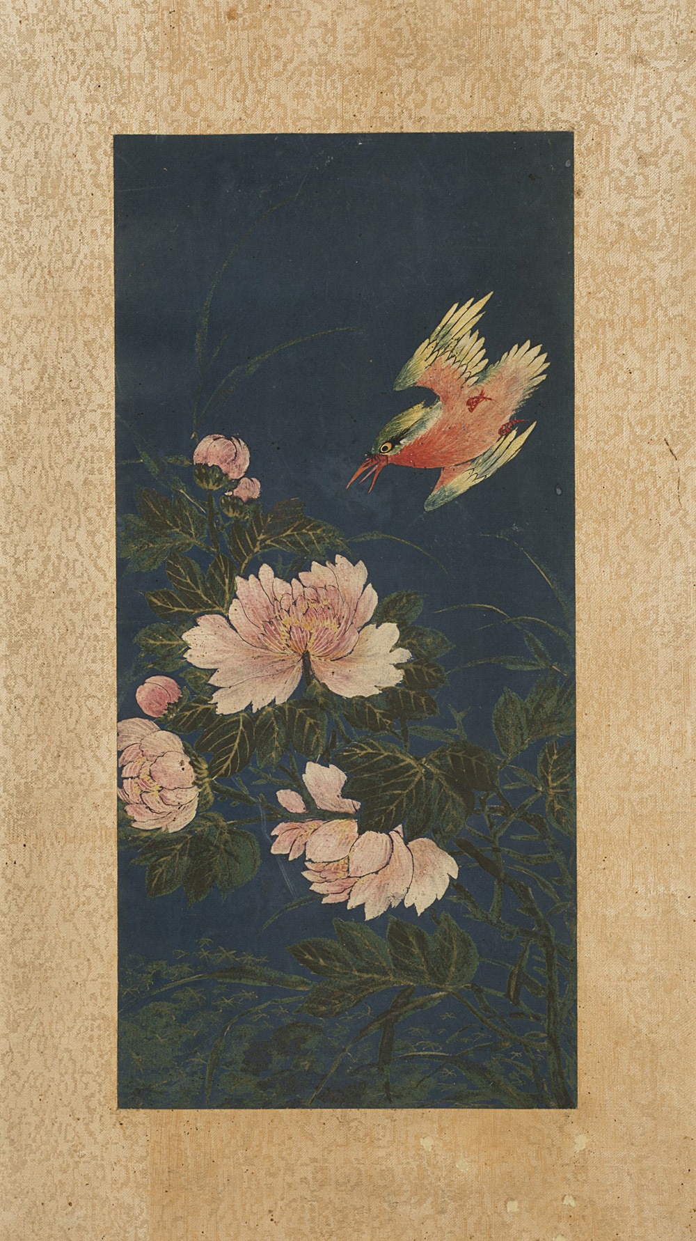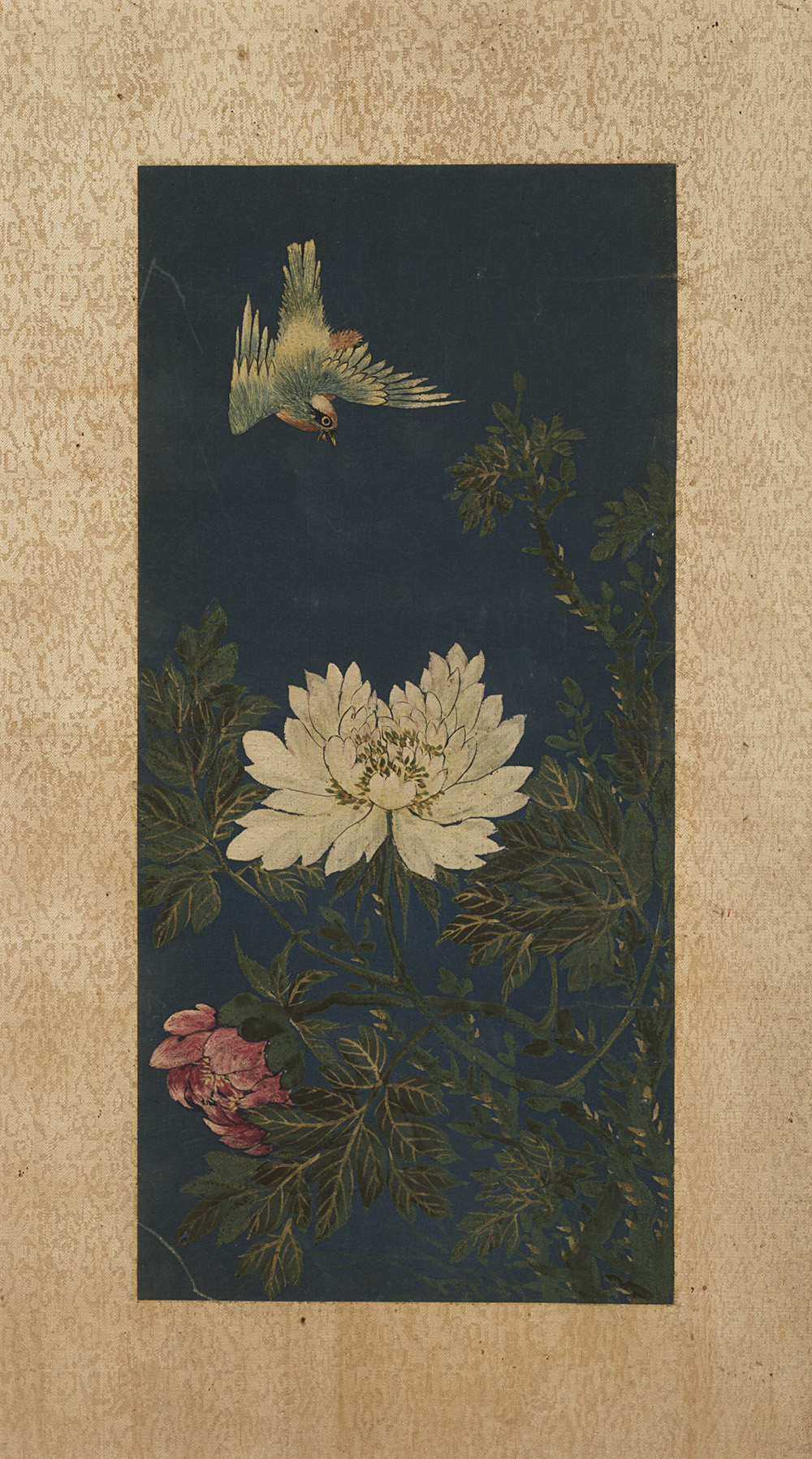 Coppia di dipinti raffiguranti fiori e uccelli, inchiostro e colore su seta,...