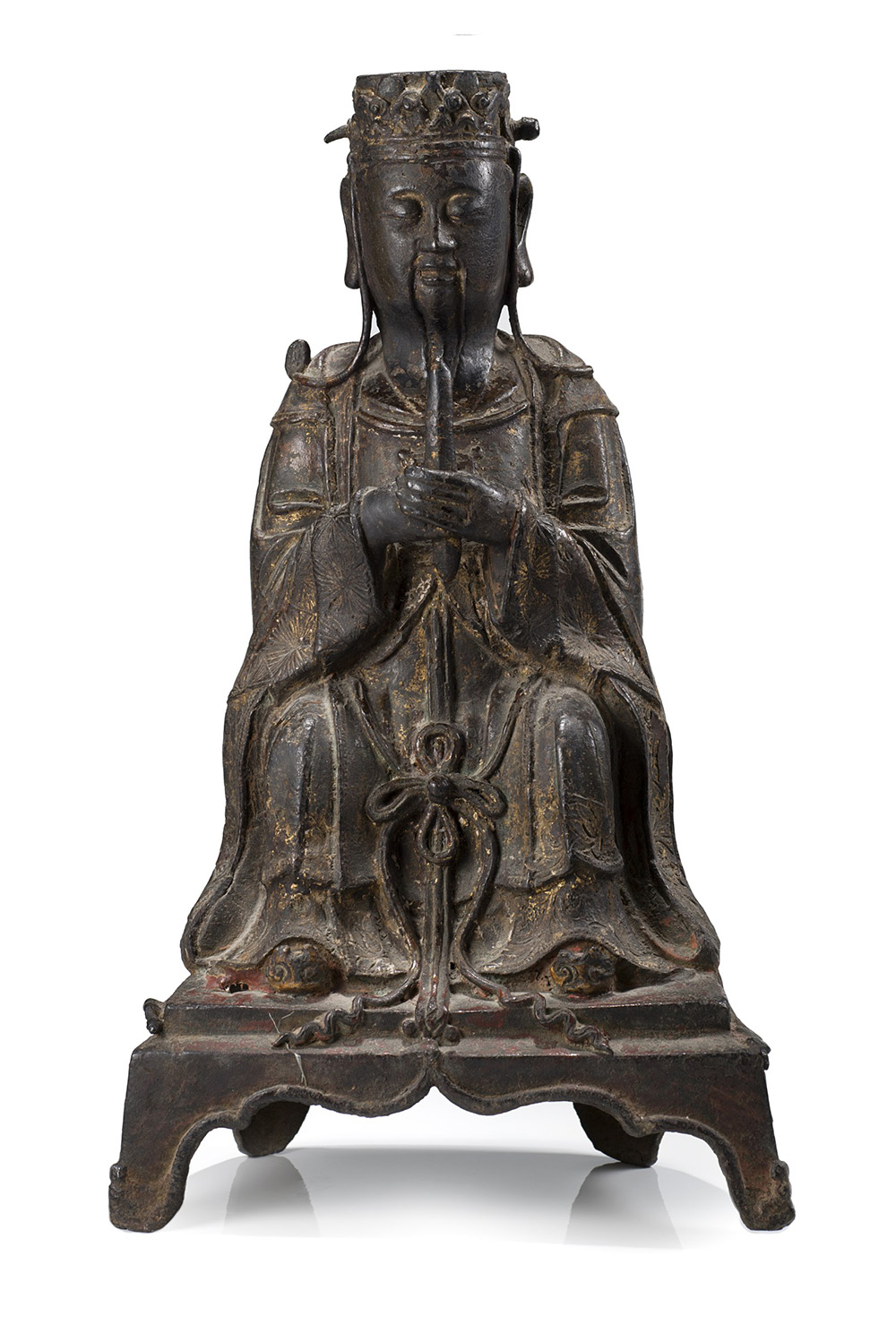 Scultura in bronzo con tracce di laccatura e doratura raffigurante un ufficiale con copricapo seduto su base rettangolare, indossa lunghe vesti e stringe una tavoletta hu (difetti) Cina, tarda dinastia Ming, sec. XVII A bronze figure of an official holding a hu tablet, wearing long robes and a hat, seating on a rectangular base (minor losses) China, late Ming dynasty, 17th century (h. 33 cm.)
