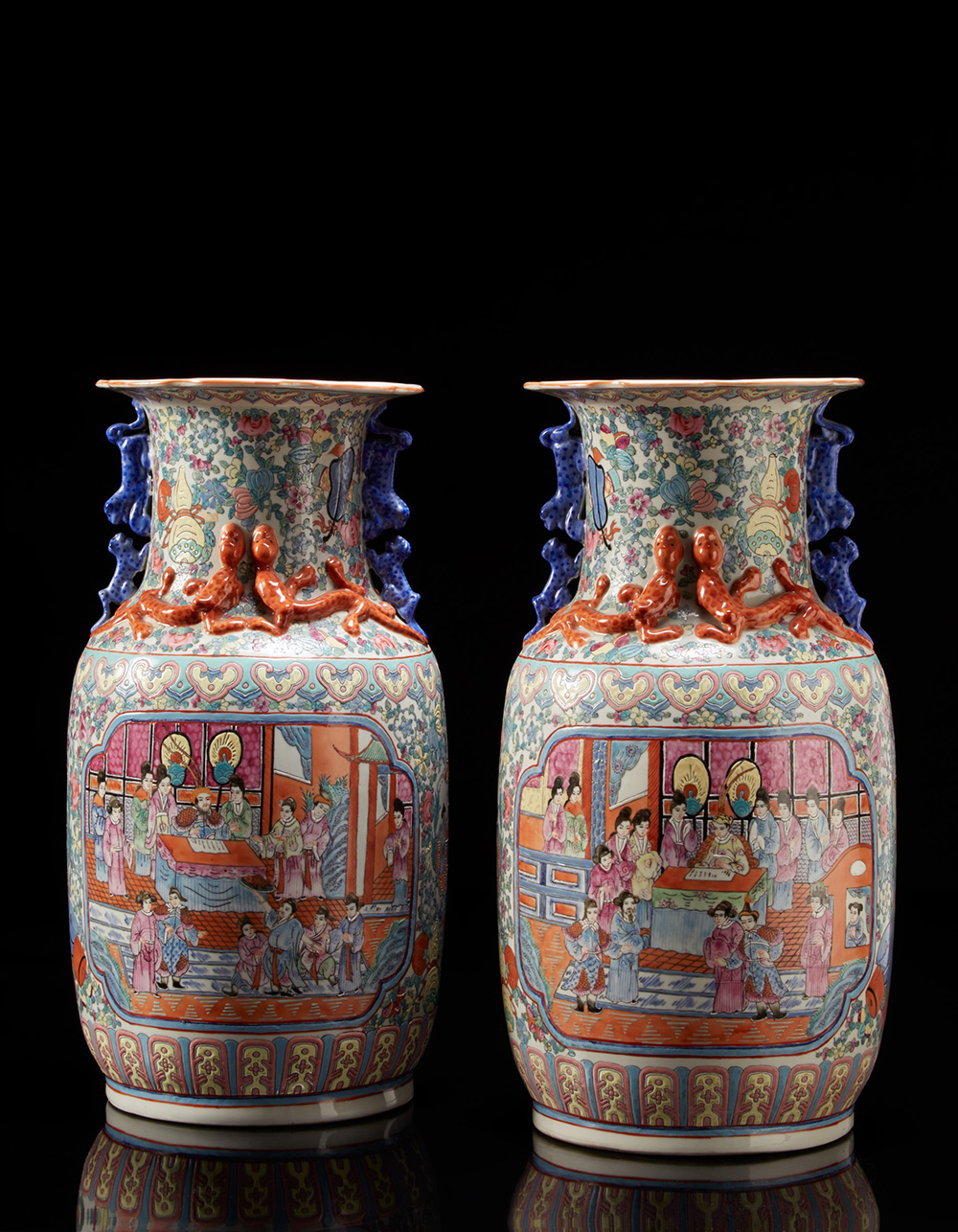 Coppia di vasi in porcellana policroma con anse leonine e chilong applicati...