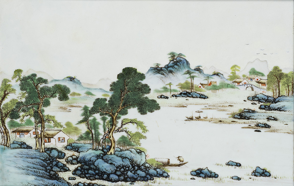 Coppia di placche rettangolari in porcellana decorate con scene di paesaggio con padiglioni e fiumi con montagne in lontananza, con cornice in legno Cina, periodo della Repubblica (1919-1949) A pair of rectangular porcelain plaques enamelled with landscape scenes featuring pavilion on shore and mountains in the distance, with wood frames China, Republic period (1919-1949) (la porcellana/the porcelain 38x25 cm.)