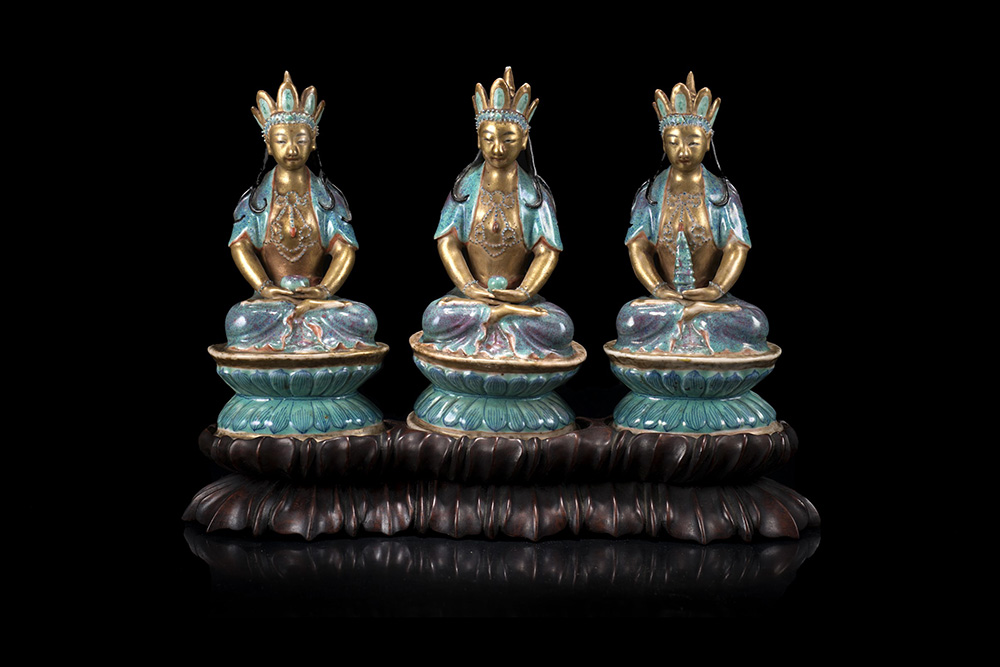 Set di tre Buddha in porcellana con smalti "robin's egg", raffigurati seduti su basi a doppio loto, ciascuno indossa gioielli e ornamenti, con base in legno Cina, sec. XX A set of three robin's egg porcelain Buddhas, each modelled seated on a double lotus base, wearing a crown and jewellery, with wood base China, 20th century (h. 12,5 cm.)