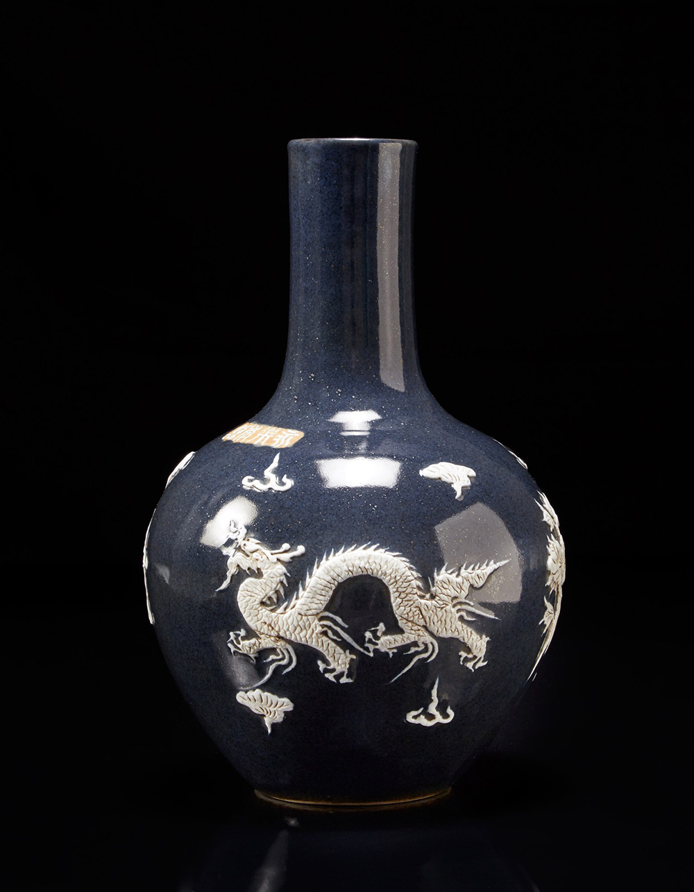 Vaso in porcellana decorato con draghi bianchi in rilievo su fondo blu con draghi e iscrizione Cina, sec. XX A bottle vase decorated in relief with white dragons on a blue ground China, 20th century (h. 39 cm.)