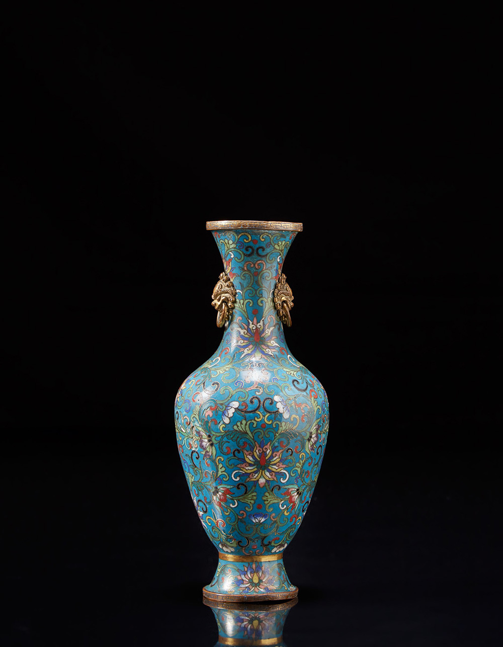 Piccolo vaso a balaustro in metallo cloisonne con doppie anse leonine, decorato con fiori su fondo turchese (difetti) Cina, inizio sec. XIX A small cloisonnè enamel baluster vase with twin lion head handles, decorated with flowers against a turquoise ground (losses) China, early 19th century (h. 22 cm.)