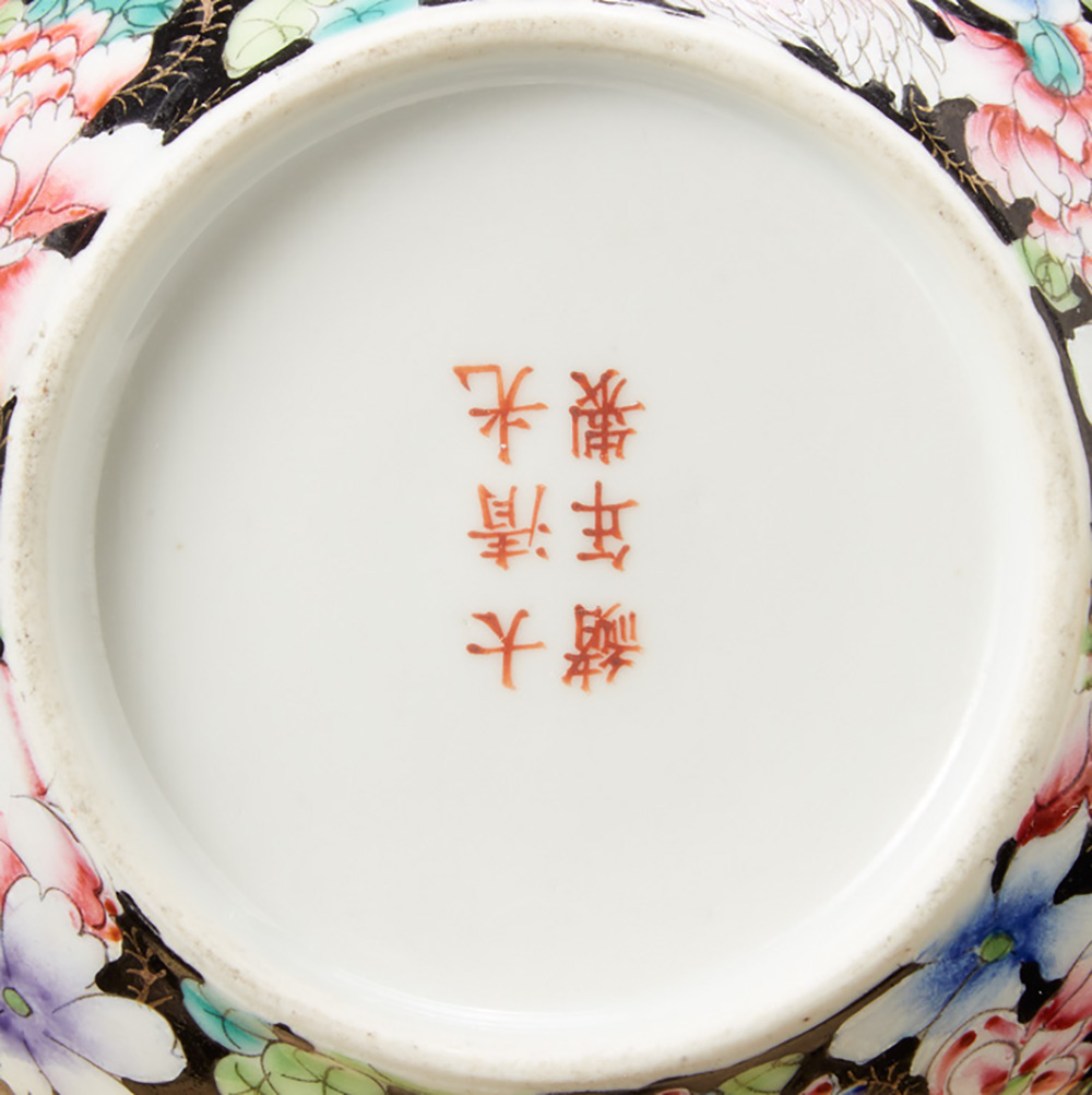 Teiera in porcellana con coperchio con decorazione "millefiori" su fondo nero Cina, marchio a sei caratteri Guangxu sul fondo e del periodo (1875-1908) A 'millefleurs' porcelain teapot and cover, decorated with a multitude of flowers against a black ground China, Guangxu six character mark to the base and of the period (l. 22 cm.)