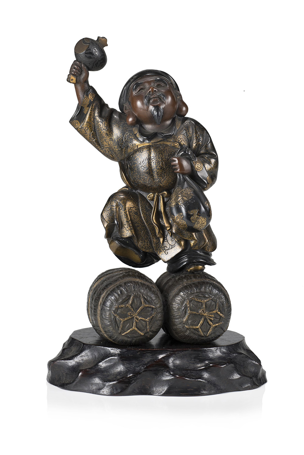 Figura in bronzo con sacco e botte di sake con base in legno Giappone, periodo Meiji (1868-1912) A bronze figure of a man with a bag and a sake barrel, with wood base Japan, Meiji period (1868-1912) (h. 17 cm.)