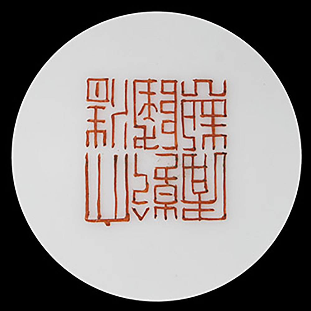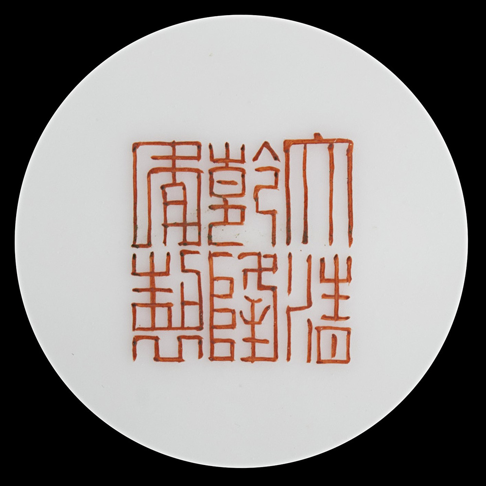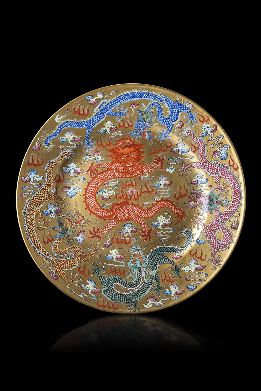 Piatto in porcellana policroma decorato con cinque dragoni e perla sacra su fondo dorato, marchio apocrifo Qianlong alla base Cina, tarda dinastia Qing (1644-1911) A porcelain dish decorated in colourful enamels with five dragons chasing the flaming pearl against a gilt ground, with apocryphal Qianlong mark to the base China, late Qing dynasty (1644-1911) (d. 19,5 cm.)