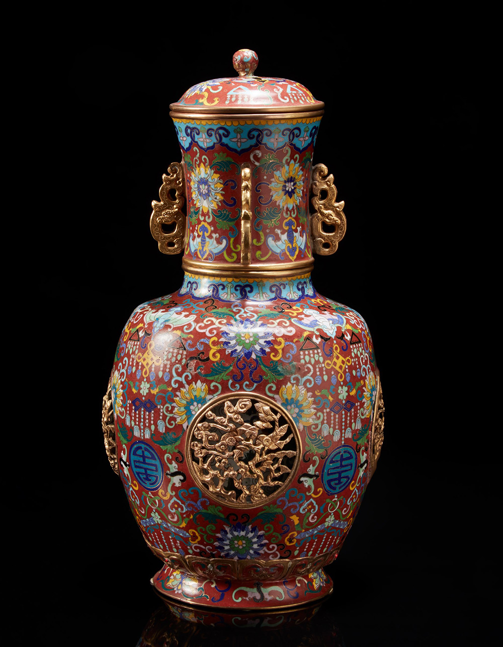 Vaso in cloisonnè reticolato con coperchio, il collo con anse a forma di fenici stilizzate e dorate, decorato con pipistrelli e simboli buddhisti su fondo rosso rubino Cina, sec. XX A reticulated cloisonnè enamel vase and cover, the neck with four stylized phoenix handles, decorated all over with auspicious bats and buddhist symbols against a ruby ground China, 20th century (h. 50 cm.)