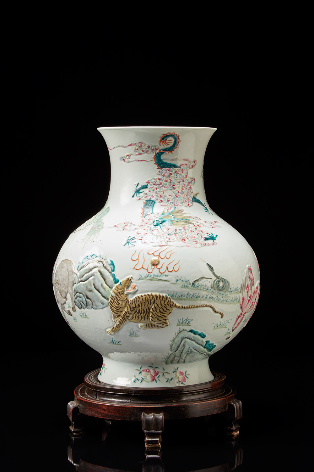 Vaso in porcellana con decori policromi in rilievo degli animali dello zodiaco, con base in legno (restauri) Cina, sec. XIX A polychrome porcelain vase decorated with zodiac symbols in high relief, with wood base (restorations) China, 19th century (h. 49 cm.)