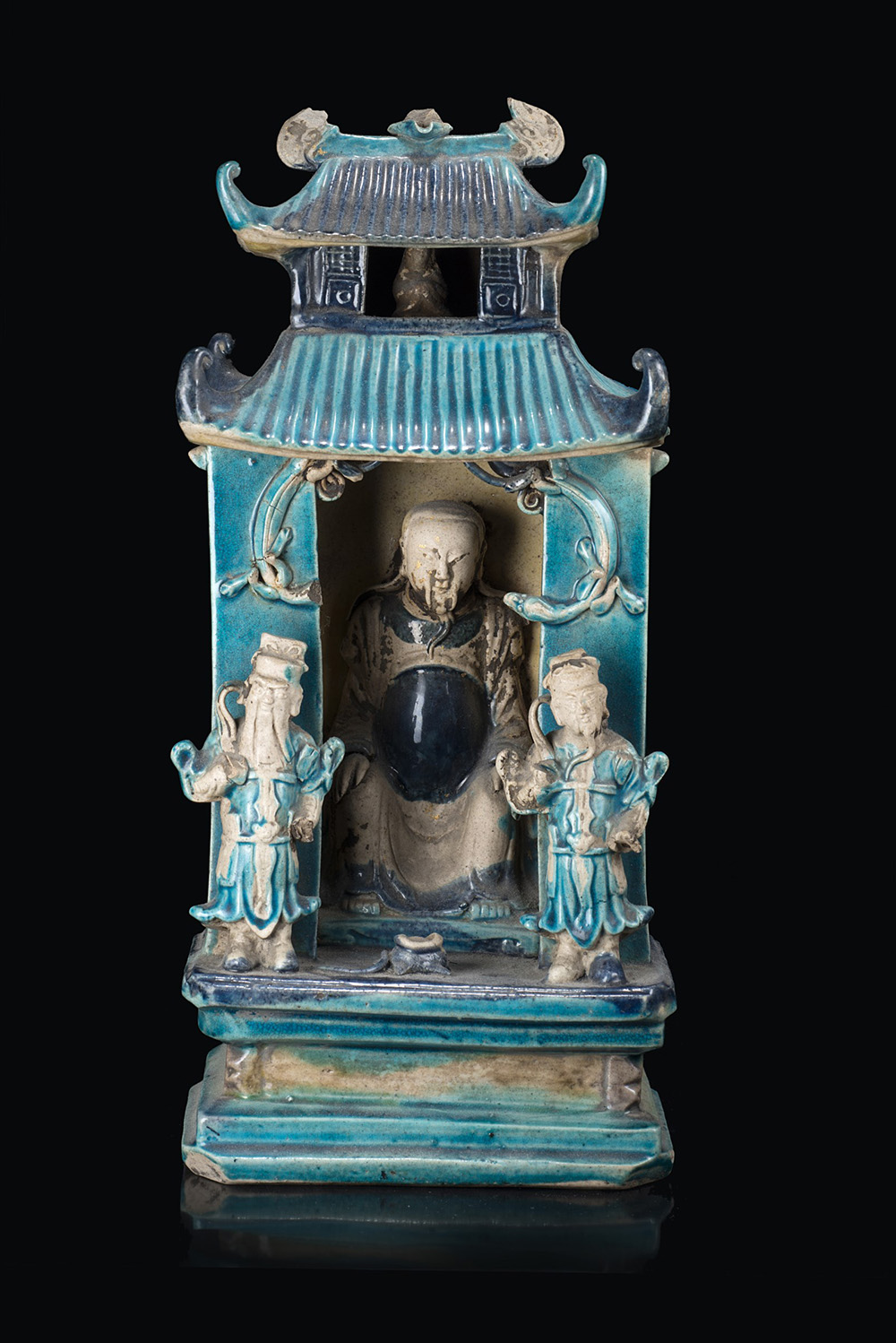 Piccolo tempio in biscuit smaltato in turchese e color melanzana, decorato con figure e guardiani (difetti e mancanze) Cina, periodo Kangxi (1662-1722) A biscuit temple enamelled in turquoise and aubergine colour (losses) China, Kangxi period (1662-1722) (h. 29 cm.)