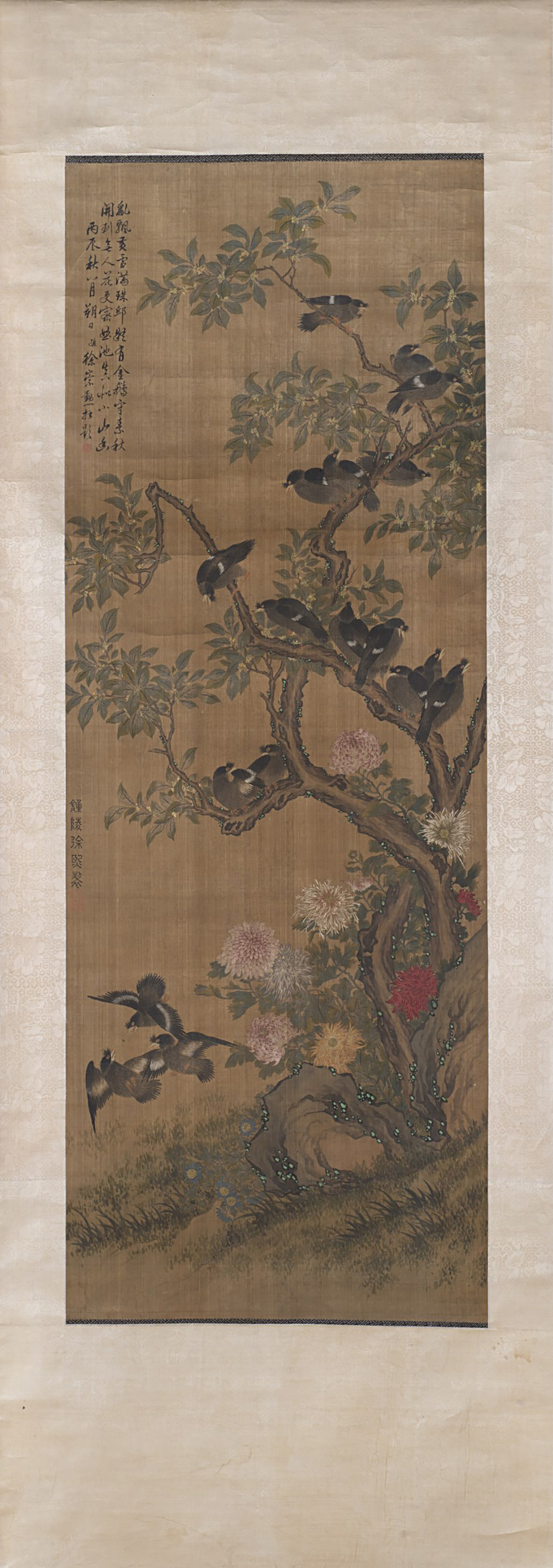 Scroll verticale raffigurante paesaggio primaverile, inchiostro e colori su seta, con terminali in porcellana Cina, XVIII sec. A vertical scroll depicting the spring season, ink and colours on silk, with porcelain scroll ends China, 18th century (161x56 cm.)