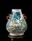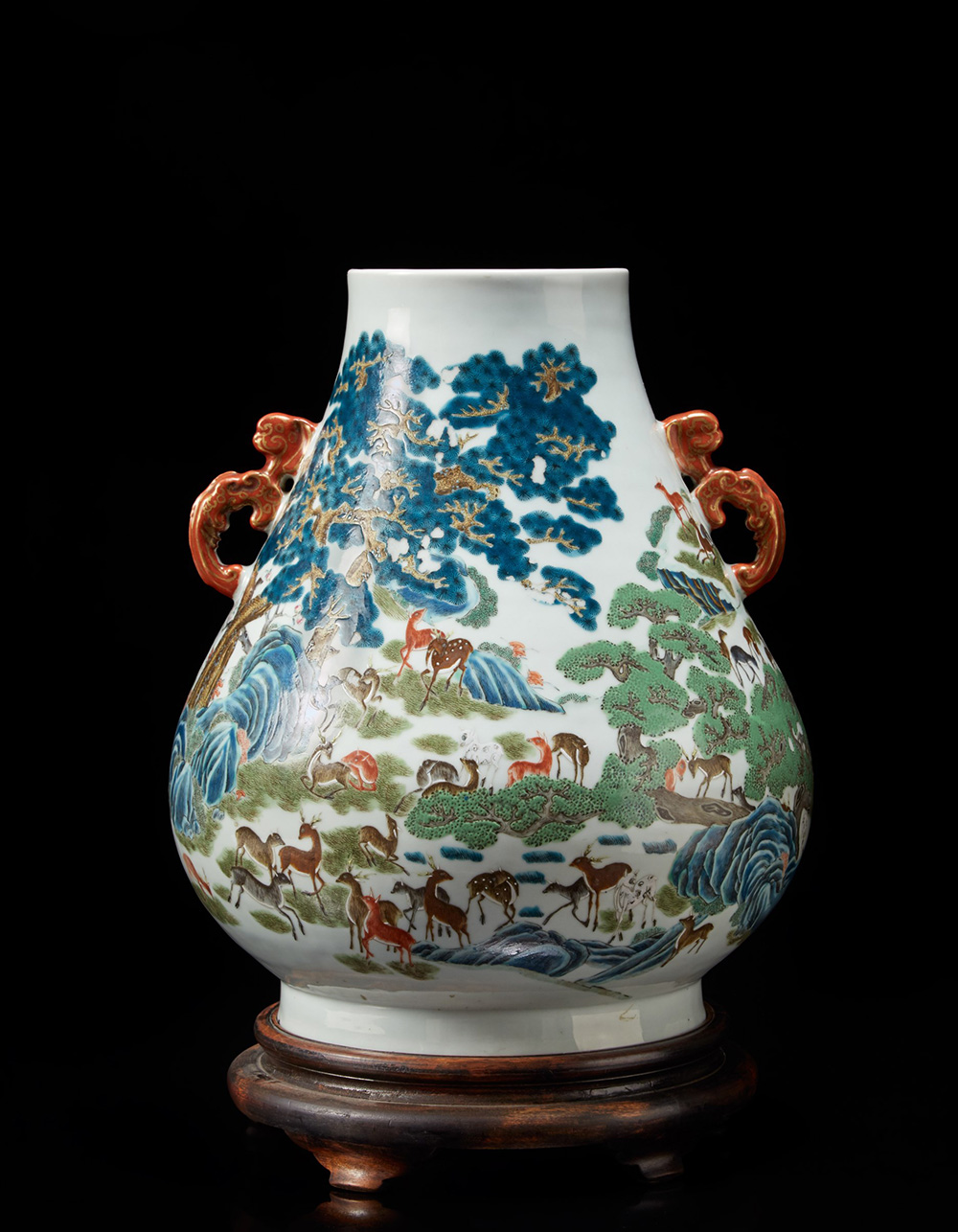 Vaso in porcellana decorato con il motivo dei "cento cervi", dalla caratteristica forma arcaica hu, adornato da doppie anse color corallo con dettagli dorati, dipinto con vividi colori raffiguranti un branco di cervi dal manto marrone a macchie bianche al pascolo in un paesaggio ricco di alberi di pino con ruscelli e montagne in lontananza, con marchio apocrifo Qianlong sul fondo, con base in legno Cina, epoca Guangxu (1875-1908) A 'hundred deer' vase, of archaistic hu shape, flanked with twin iron-red and gilt handles, painted in vivid enamels with a heard of deer with white-spotted brown coats at graze in a landscape with pine trees and streams and mountains in the distance, with apocryphal Qianlong mark to the base, with wood base China, Guangxu period (1875-1908) (h. 47 cm.)