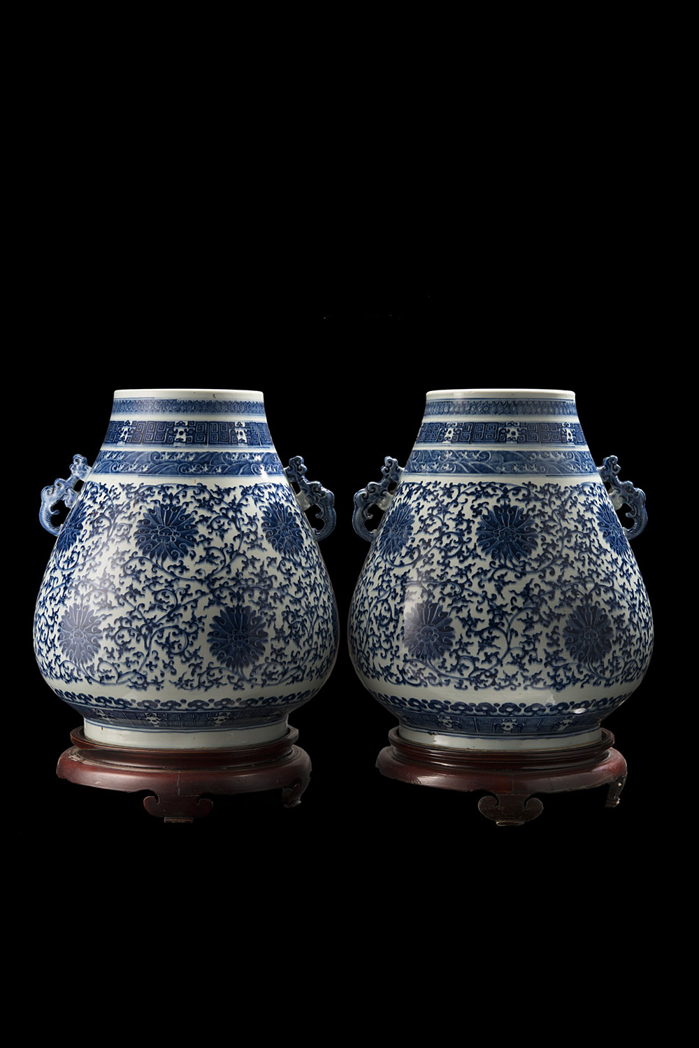 Coppia di vasi in porcellana bianca e blu, dalla caratteristica forma arcaica hu, adornati da doppie anse, ciascuno raffinatamente dipinto con fiori e foglie di loto nei toni del blu cobalto, il collo decorato con una banda di onde sovrastata da motivi geometrici con draghi stilizzati, con basi in legno Cina, sec. XIX A pair of blue and white 'lotus' vases, of archaistic hu shape, applied with a pair of mouldedᅠ handles, each finely painted in cobalt tones with a dense lotus scroll, with a band of geometric pattern and stylised dragons below the mouth rim above a register of crashing waves, with wood bases China, 19th century (h. 44 cm.)