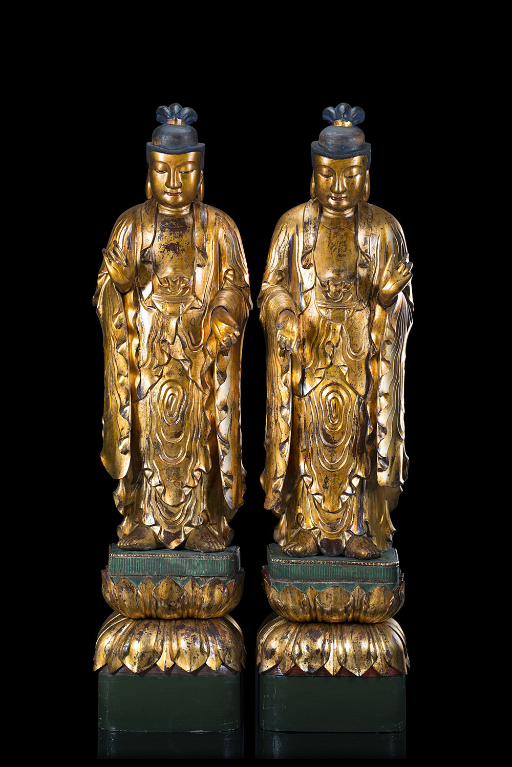Rara e raffinata coppia di bodhisattva stanti realizzati in legno scolpito, laccato e dorato, ciascuno con volto dall'espressione serena, occhi semichiusi e orecchie dai lunghi lobi, la testa sormontata da un chignon di capelli dal tono blu, il corpo elegantemente coperto da morbide tuniche drappeggiate che rivelano parte del petto ed i piedi nudi, poggianti su base adornata da una doppia corona di petali di loto (difetti e mancanze) Cina, dinastia Ming, sec. XVII *Per questo lotto è disponibile l'Attestato di Libera Circolazione A rare and elegant pair of carved, gilt and lacquered wood figures of Bodhisattvas standing on rectangular double lotus bases, each portrayed with half-opened eyes and typical serene facial expression framed by long, pendulous ears, the head surmounted by an elegant top-knot of blue hair, wearing long robes draping the body with gentle waves revealing part of the chest and the bare feet China, Ming dynasty, 17th century *Export Licence is avaliable for this lot (h. 168 cm.; la statua/the statue h. 122 cm.)