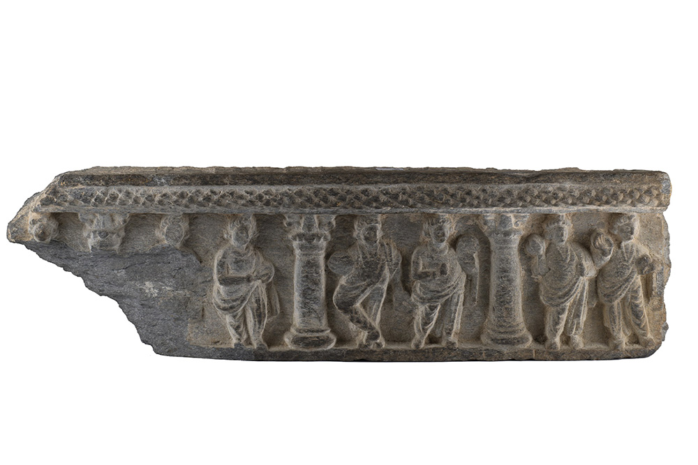 Antico fregio in scisto grigio, decorato in basso rilievo, con figure dagli abiti drappeggiati, con supporto (difetti) An ancient gray schist architectural element, carved in low relief with figures wearing draping robes (losses) (38x11 cm.)