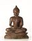 Buddha in bronzo raffigurato seduto, il volto con espressione serena, i...