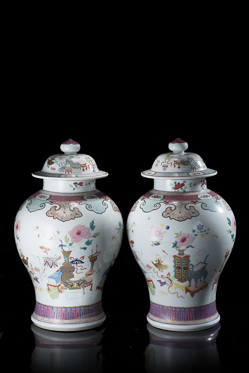 Coppia di vasi a balaustro in porcellana con coperchio, decorati in Famiglia Rosa e doratura con oggetti preziosi e fiori, sotto una ricca bordatura geometrica (difetti minori) Cina, sec. XVIII A pair of Famille Rose baluster vases and covers, each decorated in gilt and enamels with precious objects and flowers below a rich lappet border (minor losses) China, 18th century (h. 43 cm.)