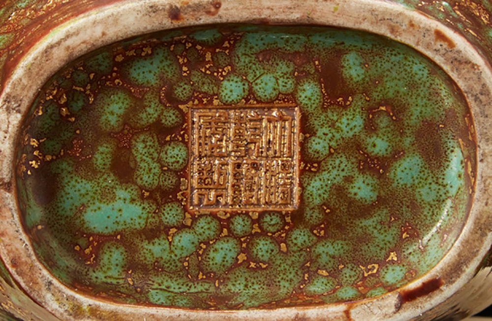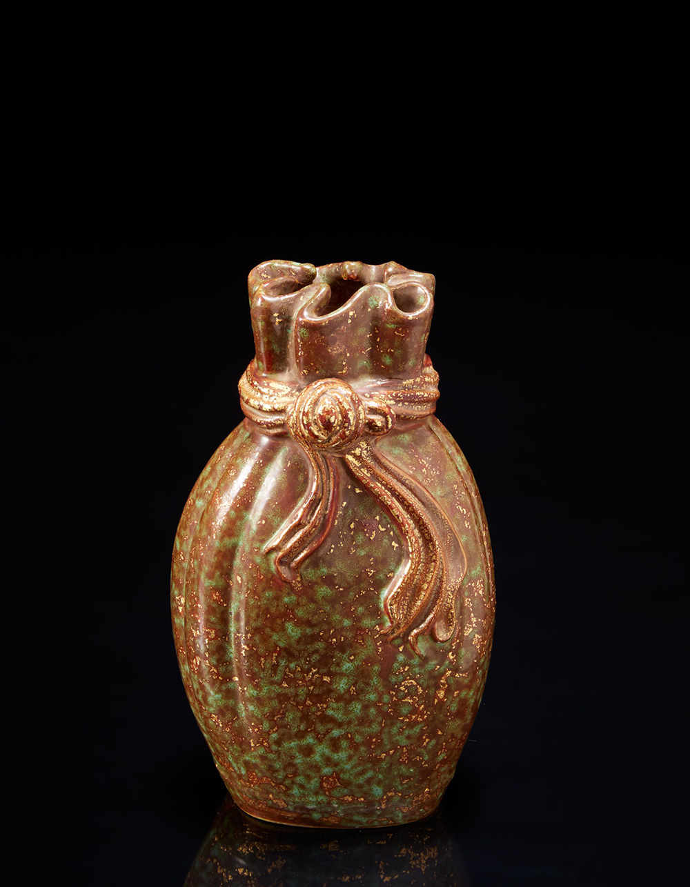 Vaso in porcellana di forma lobata abbellito da nastro annodato al collo, con invetriatura verde-marron e lumeggiature, marchio apocrifo Qianlong alla base Cina, sec. XX A porcelain vase of lobbed form embellished with a tied ribbon at the neck glazed in green, brown and gilt, apocryphal Qianlong mark to the base China, 20th century (h. 19 cm.)