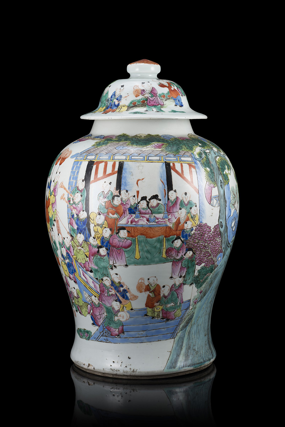 Giara a balaustro con coperchio in porcellana Famiglia Rosa decorato con scena di bambini in processione Cina, sec. XIX A baluster jar and cover in Famille Rose porcelain decorated with chidren in procession China, 19th century (h. 40 cm.)