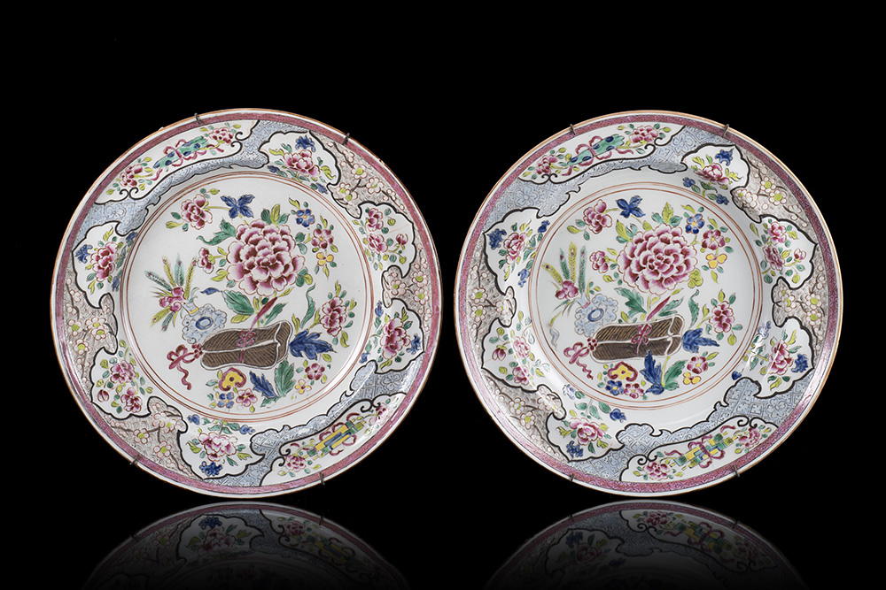 Coppia di piatti in porcellana Famiglia Rosa decorati con motivi floreali...