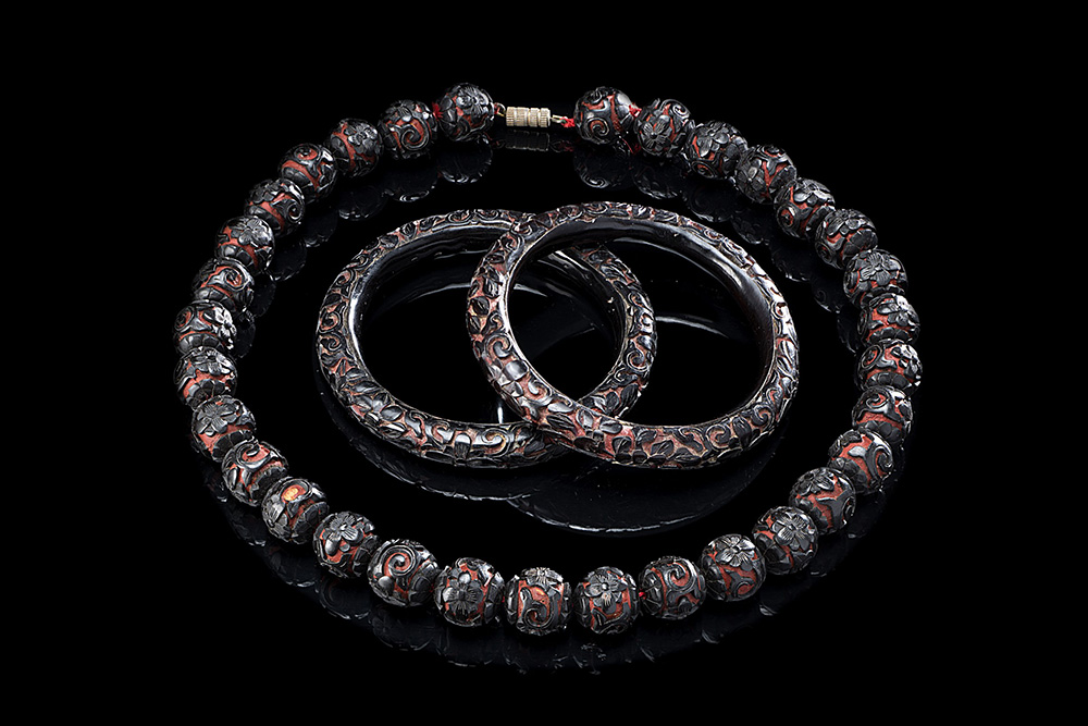 Due bracciali e una collana in lacca intagliata nera e rossa Two bangles and a beaded necklace in red and black lacquer (l. max 26 cm.)