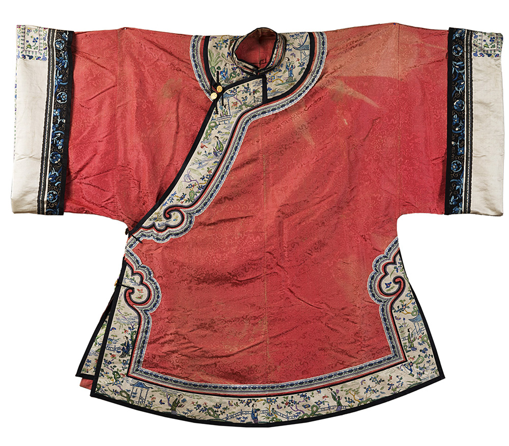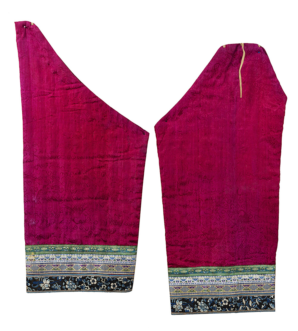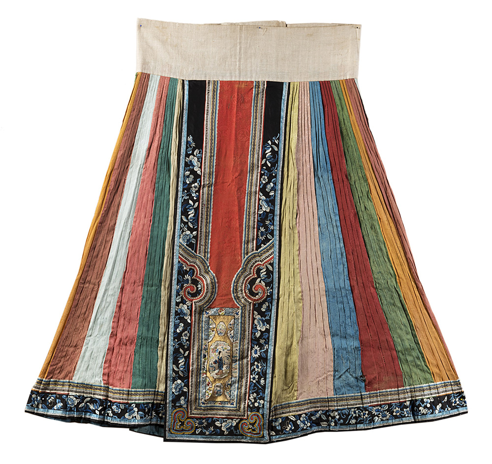 Gruppo di tre tessuti in seta ricamata: casacca nei toni dell'arancione, una gonna e un paio di maniche imbottite (difetti) Cina, fine XIX sec. / inizio XX sec. A group of three embroidered silk textiles, comprising a jacket, a skirt and a pair of sleeves (losses) China, 19th-20th century circa (casacca / jacket 100x123 cm.) (gonna / skirt 150x95 cm.) (maniche / sleeve l. 74 cm.)