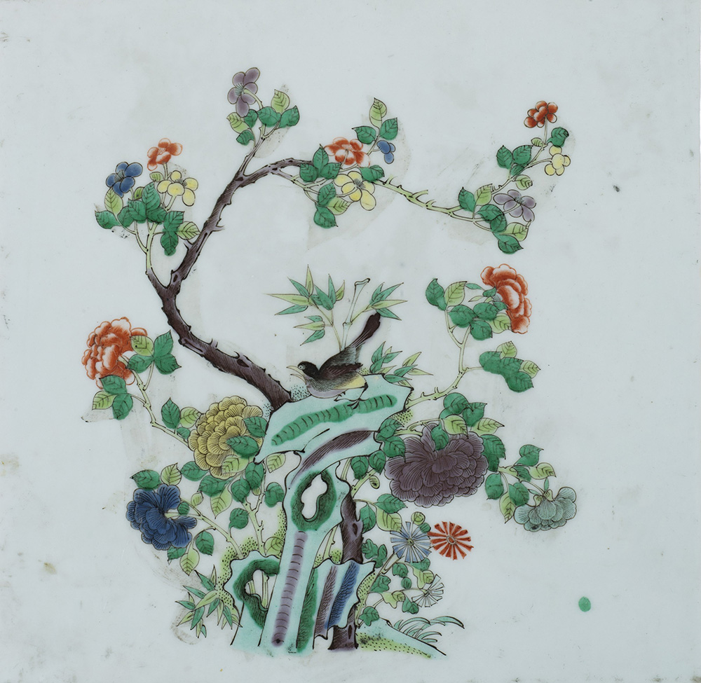 Piastrella in porcellana in smalti Famiglia Verde, decorata con uccello tra rami in fiore e rocce Cina, sec. XIX Prov.: con etichetta Galleria San Giorgio, Modena A Famille Verte enamelled tile, decorated with a perched on flowering branch issuing from rocks China, 19th century Provenance: with label Galleria San Giorgio, Modena (25x25 cm.)
