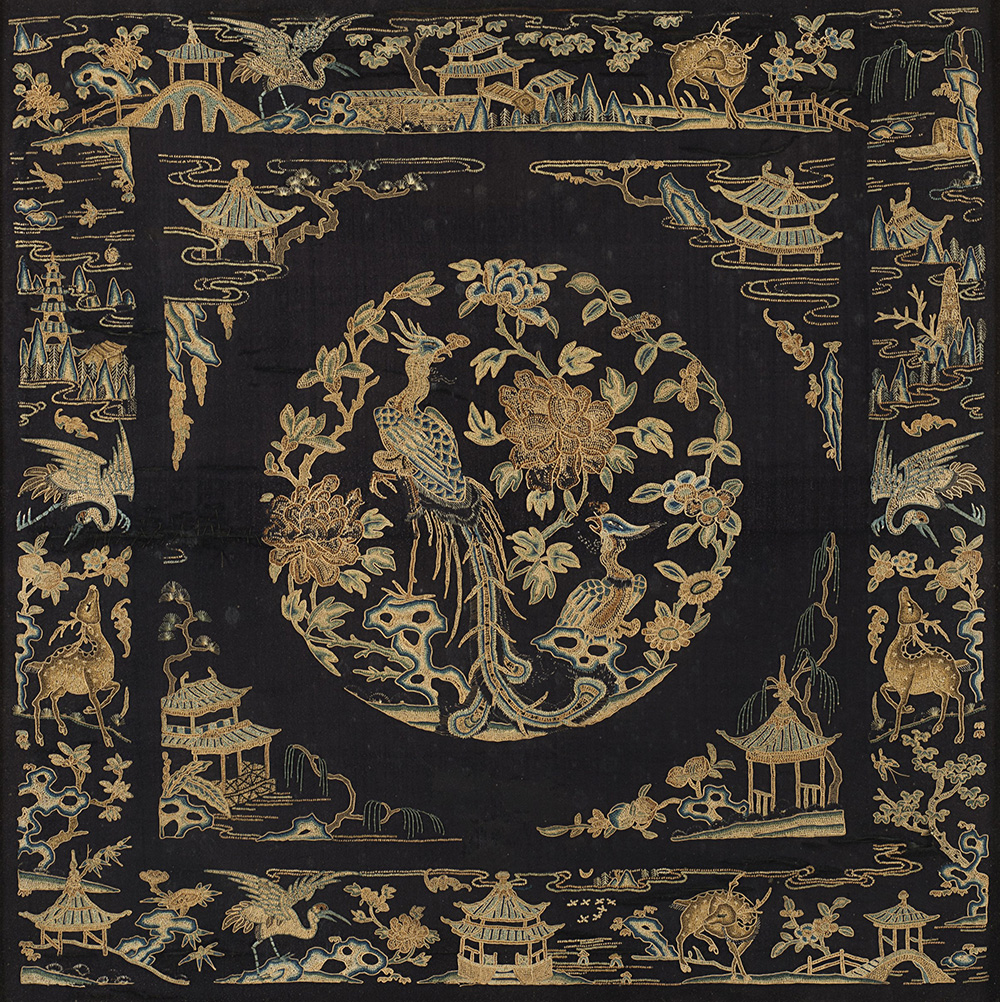 Tessuto in seta di colore blu ricamato con fili metallici color beige e oro con decorazione centrale di coppia di fenici, con cornice (difetti) Cina, sec. XIX A blue silk embroidery decorated with a central roundel depicting a pair of phoenix, mounted and framed (losses) China, 19th century (il ricamo/the embroidery: 58x58 cm.)