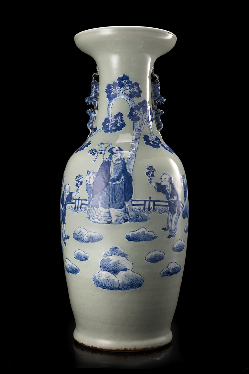 Vaso a balaustro in porcellana bianca e blu su fondo celadon, decorato in rilievo con fanciulli e saggi sotto albero di pino Cina, sec. XX A celadon-ground blue and white baluster vase, decorated in relief with sages and boy attendats underneath pine trees China, 20th century (h. 60 cm.)