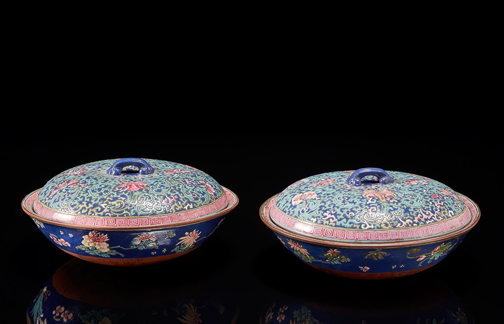 Coppia di ciotole in terracotta con coperchio smaltate con motivi floreali su fondo turchese Cina, sec. XX A pair of a turquoise ground terracotta bowls and covers decorated with floreal motifs China, 20th century (h. 27 cm.)