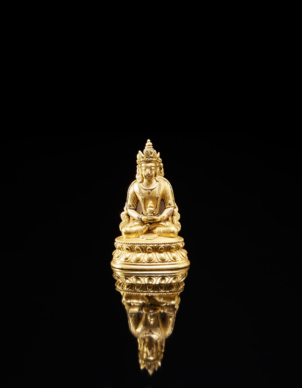 Piccolo bronzo dorato raffigurante un Amitayus seduto su base a loto, indossa corona e gioielli