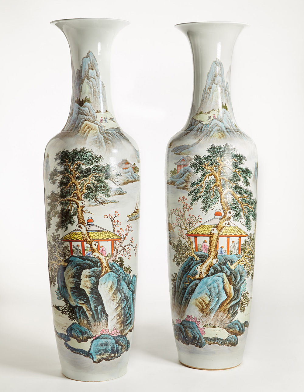 Coppia di grandi vasi in porcellana decorati con paesaggio montano A large pair of polychrome porcelain vases decorated with a mountainous landscape (h. 180 cm.)