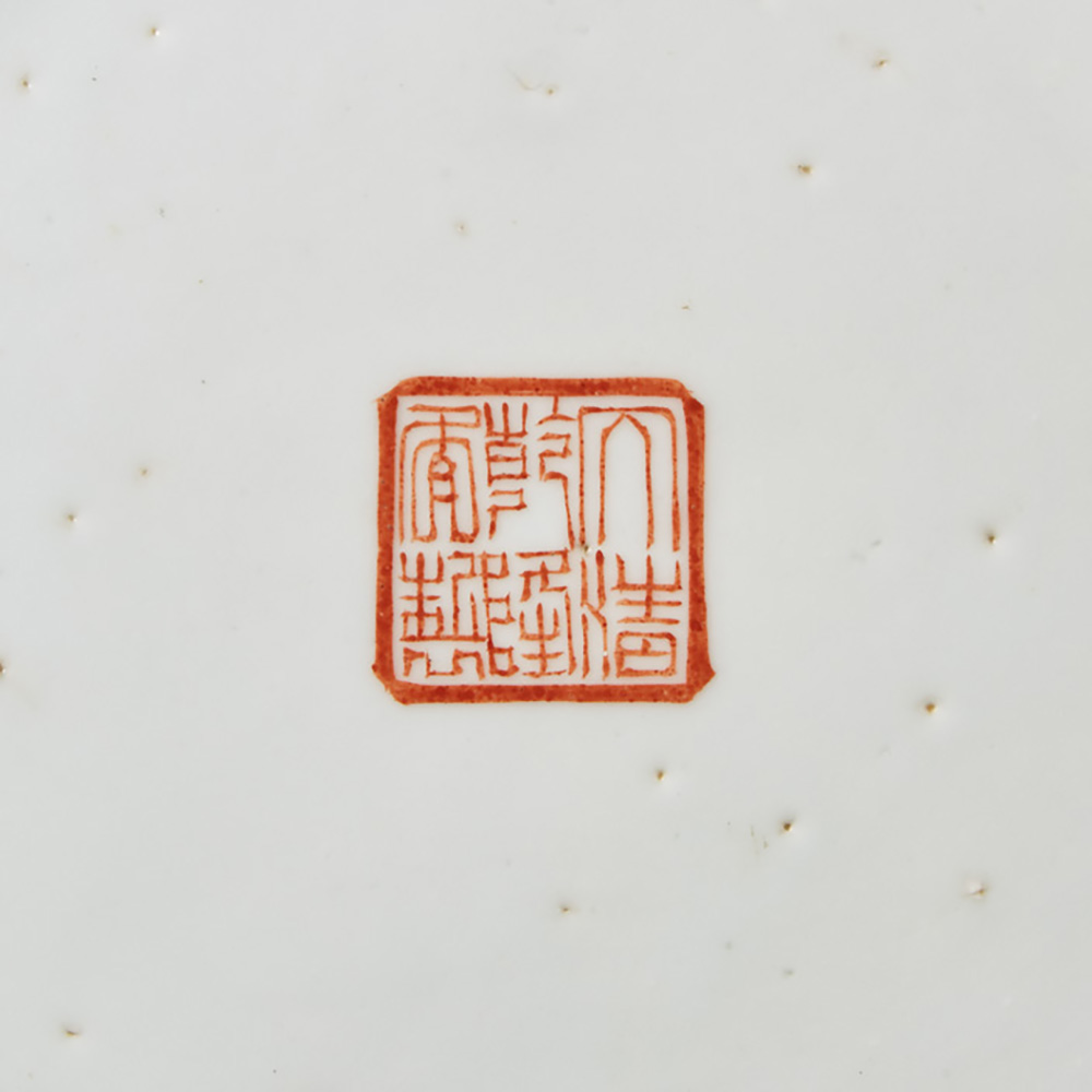Vaso in porcellana Famiglia Rosa decorato con figure in paesaggi su fondo con decorazione geometrica, marchio apocrifo Qianlong alla base Cina, periodo della Repubblica (1919-1949) A Famille Rose vase decorated with panels of figures against a geometric-patterned ground, apocryphal Qianlong mark to the base China, Republic period (1919-1949) (h. 59 cm.)