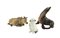 Tre animali in porcellana dipinti in policromia XX Sec. h. 17 - 10 cm. una mucca sdraiata manifattura Royal Copenaghen, un gatto e una foca manifattura Bing & Grondahl, marchio sotto le basi