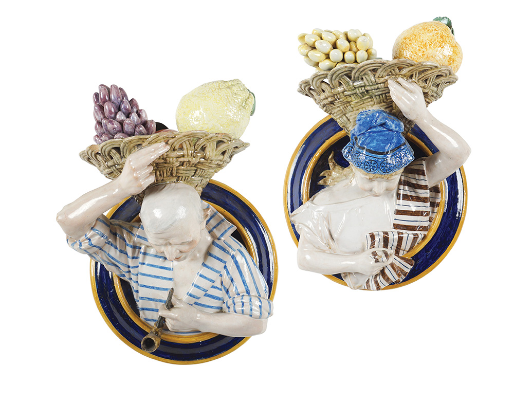 Coppia di mensole manifattura Ginori Italia, XX Sec. 26x23 cm. in ceramica smaltata e decorata in policromia raffiguranti due figure che sorreggono canestri di frutta