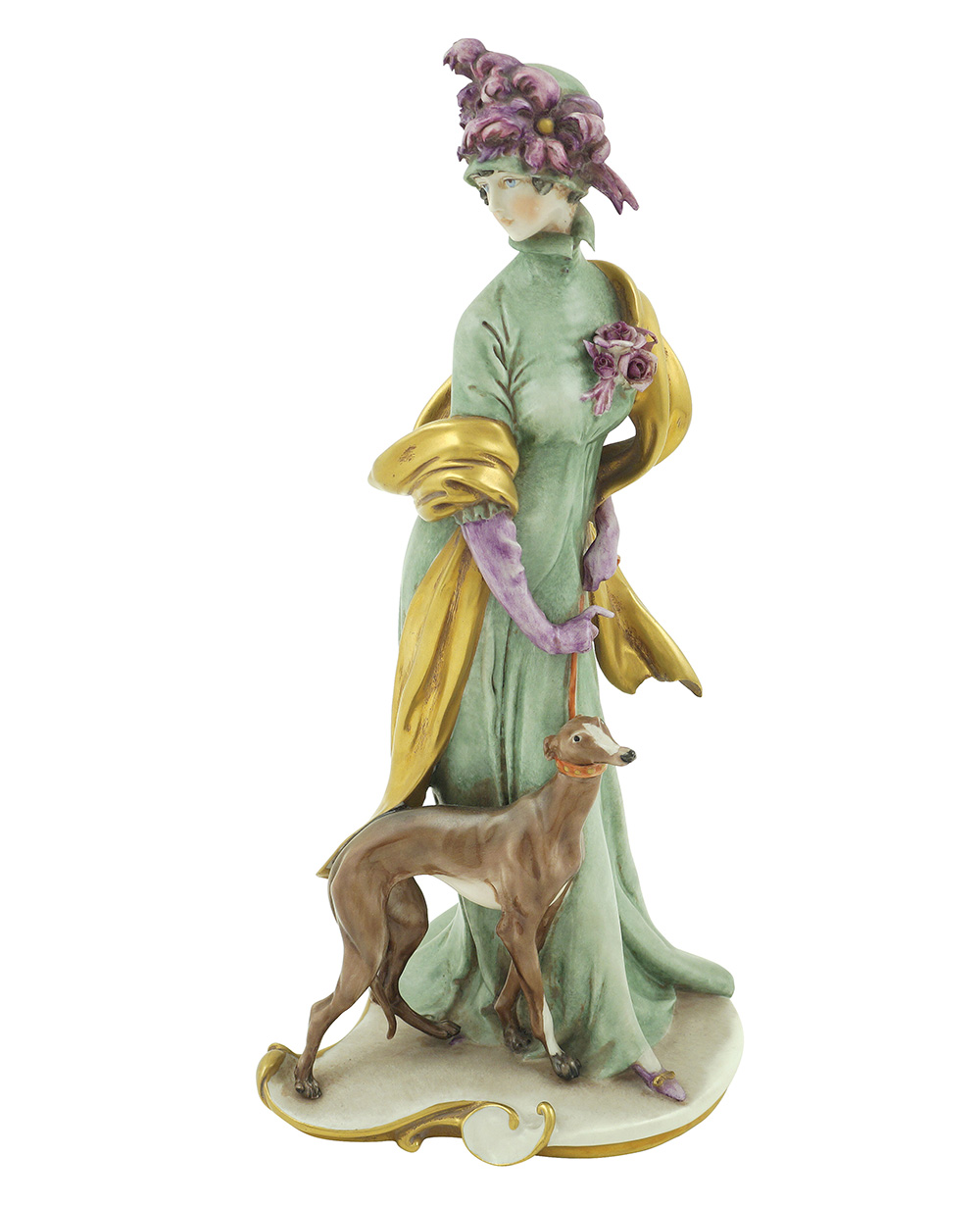 Figura in porcellana policroma Capodimonte, XX Sec. h. 26 cm. raffiguranti una gentildonna con levriero, poggiante su base sagomata, firmata G. Cappè