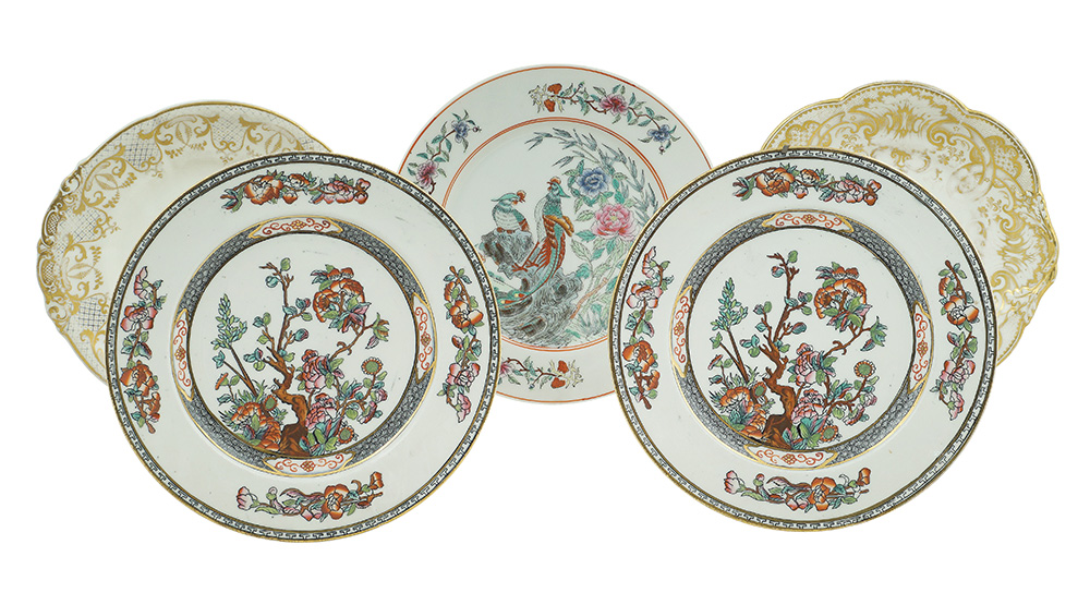 Cinque piatti in porcellana decorati in policromia, fogge, manifatture e misure diverse