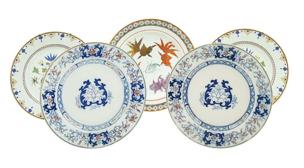 Cinque piatti in porcellana decorati in policromia, fogge, manifatture e...