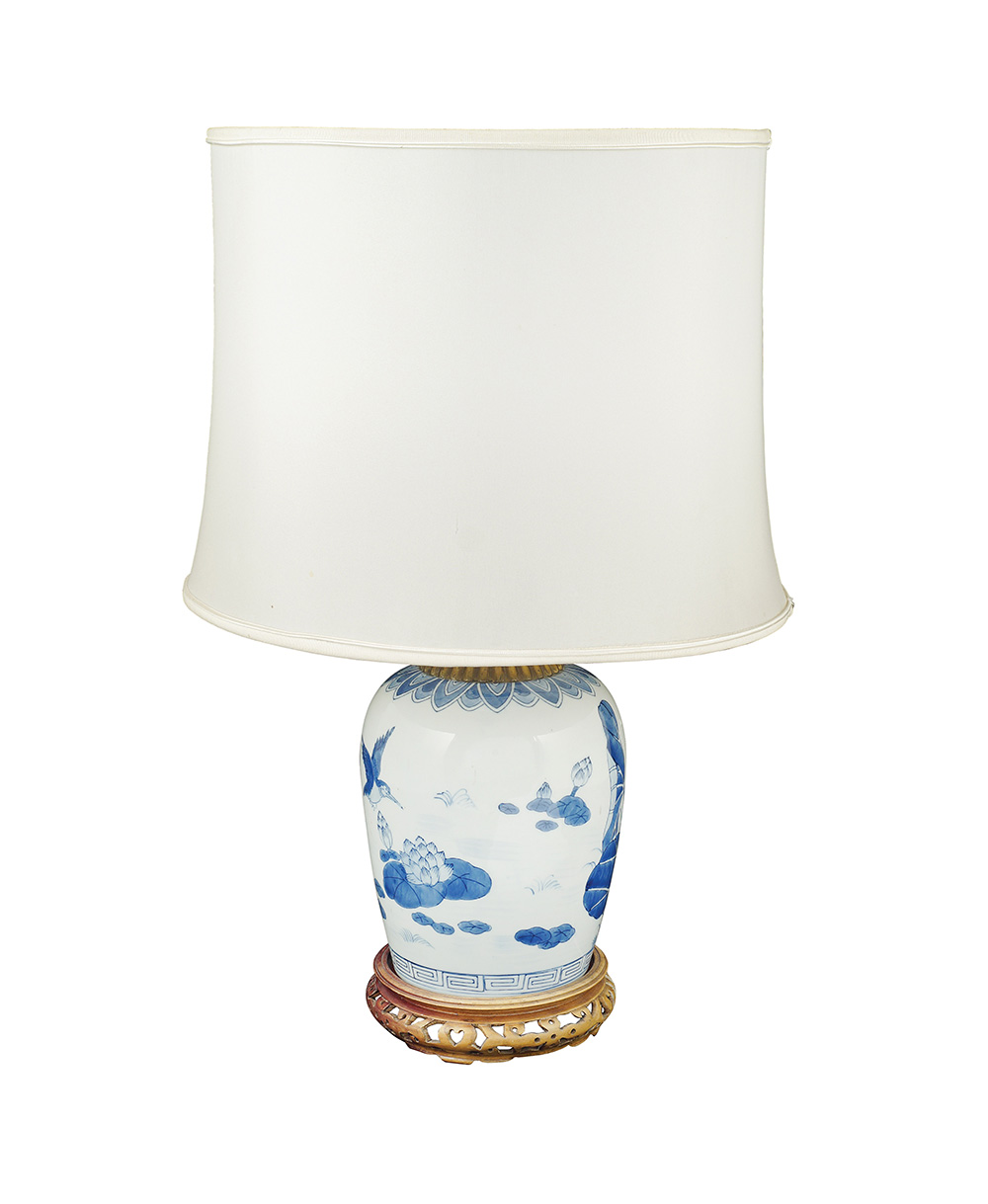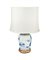 Lampada da tavolo in porcellana XX Sec. h. 37 cm. dipinta nelle tonalità del blu e del bianco decorata con motivi vegetali, base traforata in legno, completa di paralume