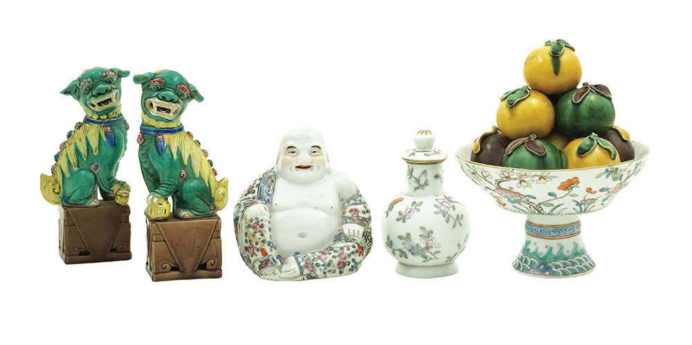 Gruppo di cinque oggetti in porcellana e ceramica manifattura orientale, XX Sec. composto da una coppia di cani di pho h. 17 cm., una scultura di Budda h. 11,5 cm., un'alzatina con frutti h. 18 cm. e una piccola bottiglia h. 11 cm., difetti e restauri